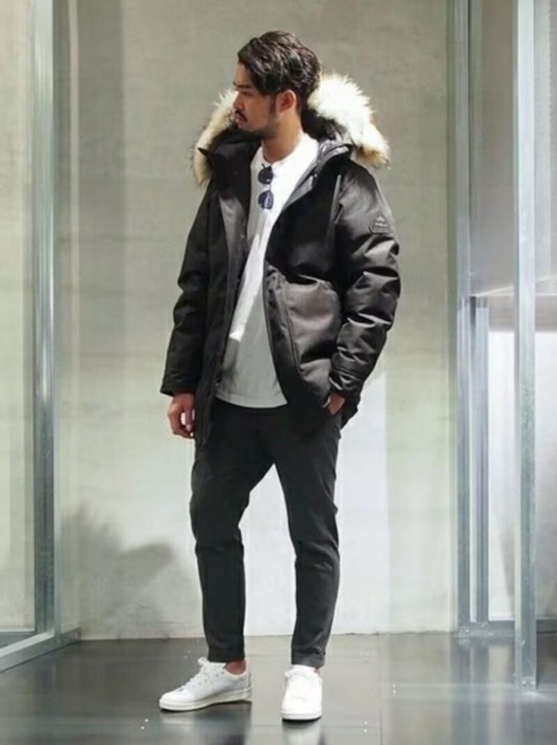 ボリュームのあるダウンジャケットは、下半身を細めのパンツで引き締めると全体のバランスが良くなります。トップスとボトムスのシルエットにメリハリをつけることで、スタイルがよく見え、野暮ったさを回避できます。