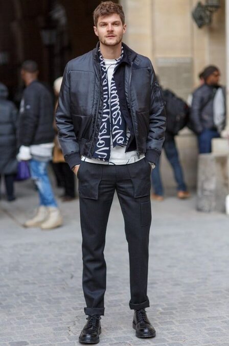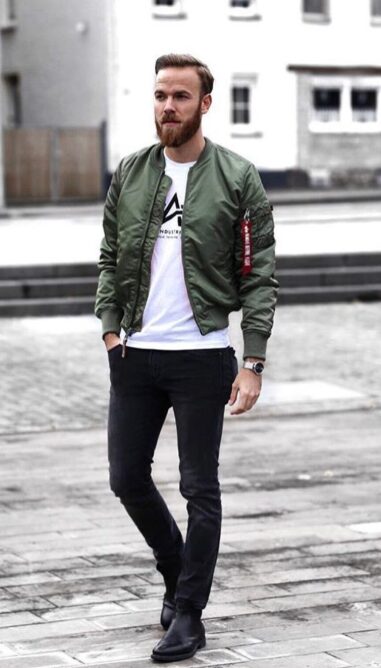 黒のボンバージャケットは万能ですが、重く見えやすいのが難点です。インナーに白や淡色を取り入れることで、黒コーデ メンズでも女性ウケしやすい印象になります。