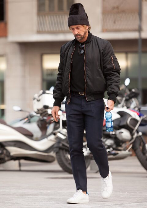 30代はカジュアルすぎないことが重要です。ボンバージャケットにスラックスを合わせ、足元をレザーシューズや上品なスニーカーでまとめると、男らしさと落ち着きを両立できます。