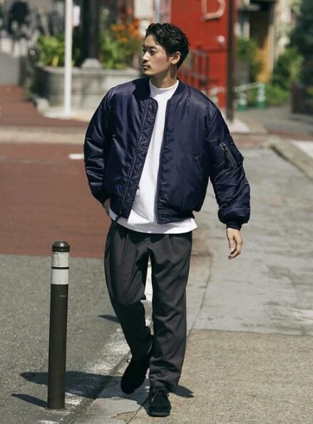 スラックスやワイドパンツなど、ボリューム感のあるボトムスとも相性が良く、きれいめにもカジュアルにも振れる点が、ボンバージャケットがトレンド としてメンズに支持される理由です。