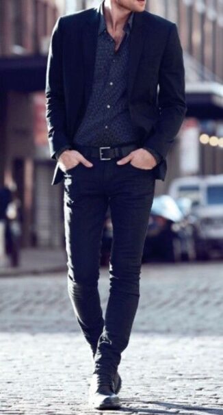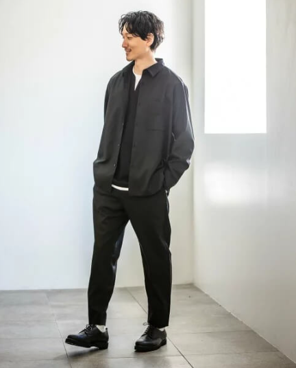 全身を黒でまとめる場合は、素材の違いを意識することで重く見えません。光沢感のあるシャツや異素材のパンツを組み合わせると、立体感が生まれ洗練された印象になります。