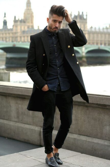 黒シャツにチェスターコートを合わせると、クラシックかつスマートな印象を作れます。チェスターコートの縦長シルエットが黒シャツのシンプルさを引き立て、大人の冬スタイルを完成させます。