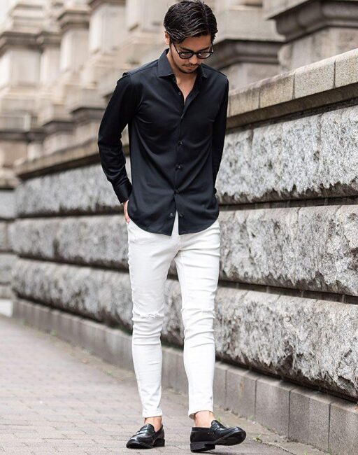 黒シャツ × スリムフィットパンツでスマートに魅せる