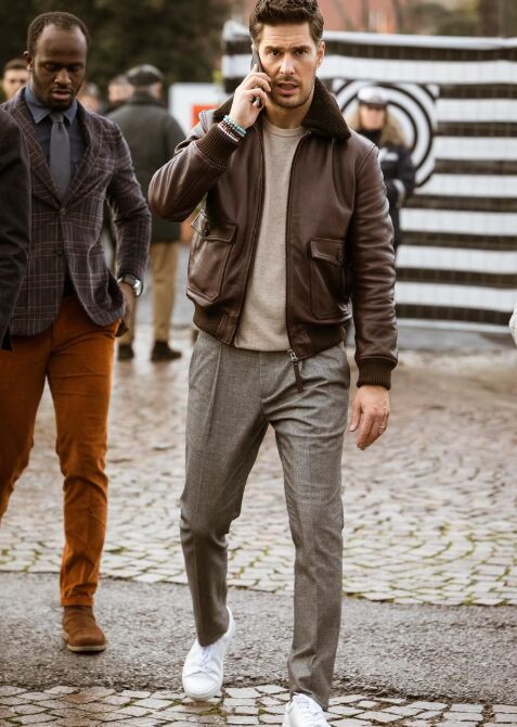 ニットやシャツと合わせやすく、レザーブルゾンメンズコーデ秋の主役になります。