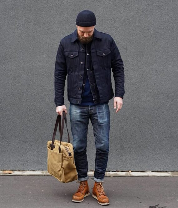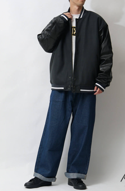 アウターや素材感を活かしたレイヤードで、デニム コーデ メンズに奥行きを出します。