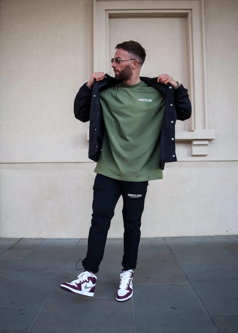 Air Jordan 4 UNDEFEATED outfit ideasでは、ミリタリーテイストやカーゴパンツと組み合わせるのが定番です。ただし、全体をダークトーンでまとめすぎず、インナーで明るさを加えると女性ウケしやすくなります。