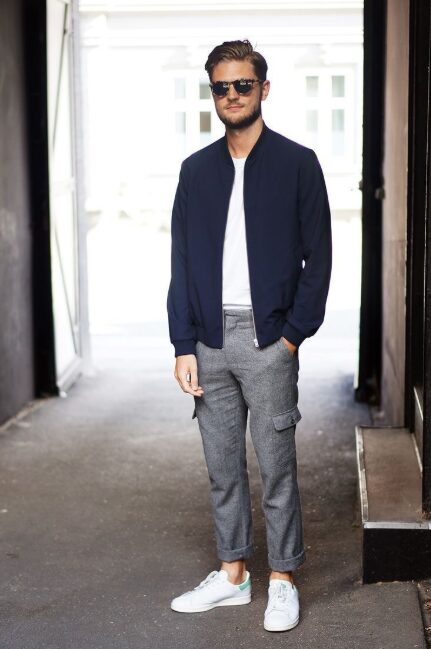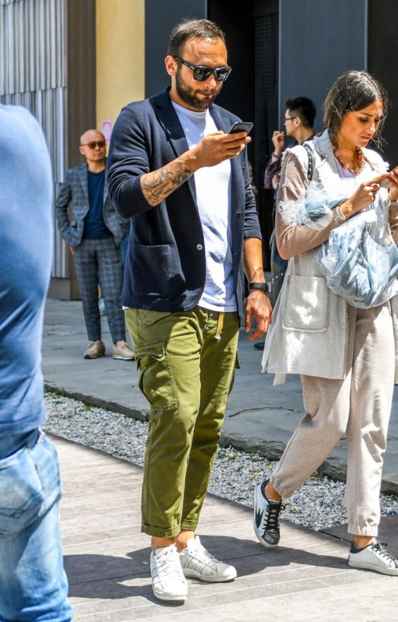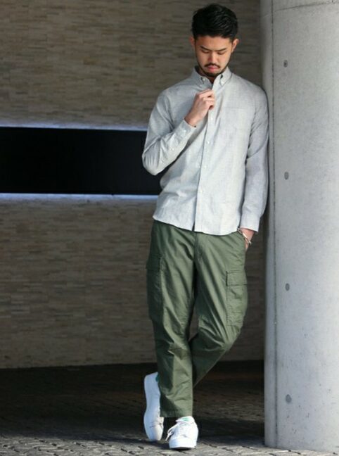 スニーカーはカーゴパンツと最も相性の良い組み合わせで、スポーティにもクリーンにも演出できます。