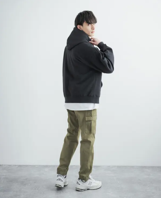 ストリートスタイルの定番として、パーカーとの相性は抜群です。ワイドカーゴパンツを合わせると今年らしい雰囲気が強まります。