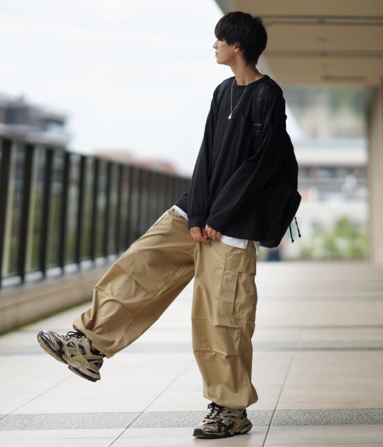 ワイドカーゴパンツは太もも太めのメンズにも相性が良く、体型カバーにも効果があります。ボリュームのあるシルエットがストリート感を強め、2026年のリラックススタイルと相性の良いコーデを作りやすいモデルです。