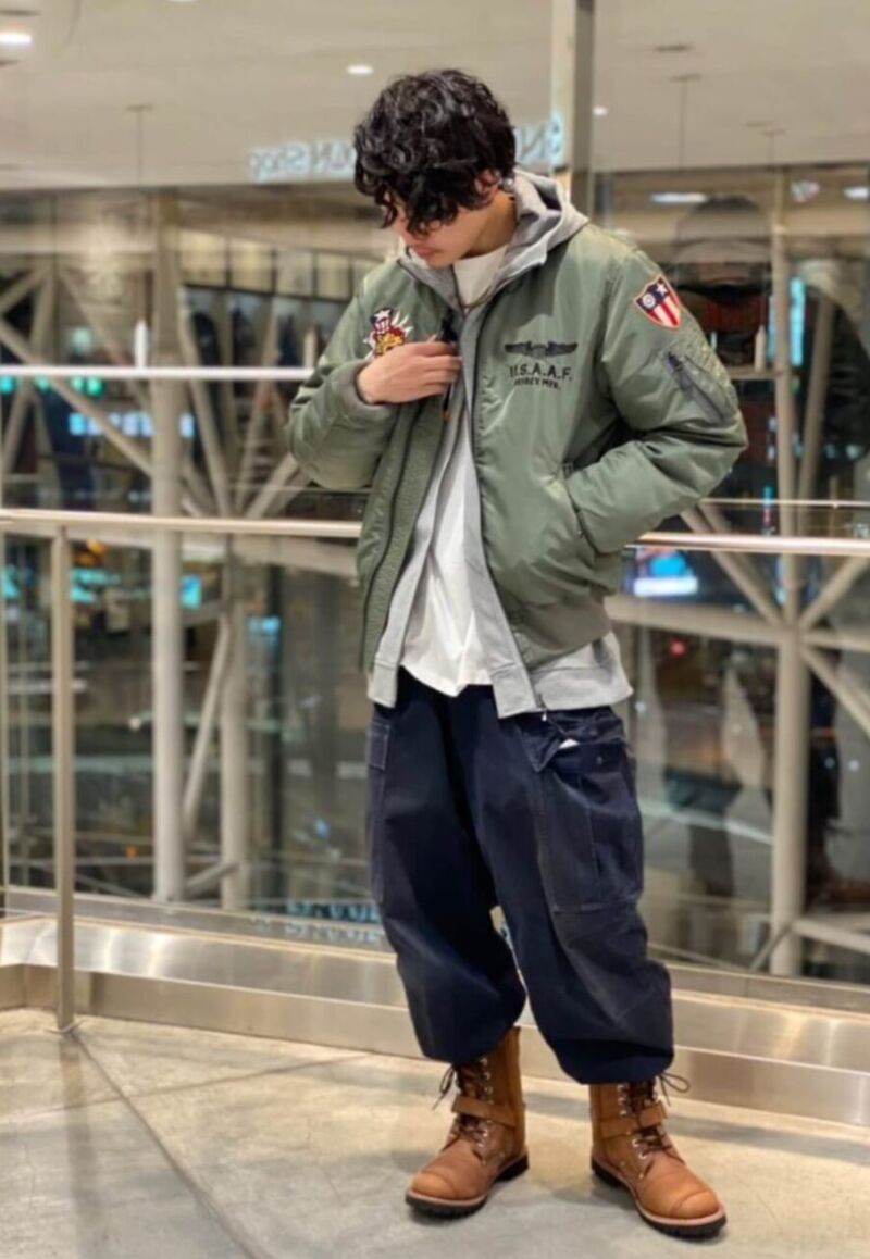 ワーク系スタイルは無骨ながら機能的で、カーゴパンツの魅力を最大限に引き出してくれます。