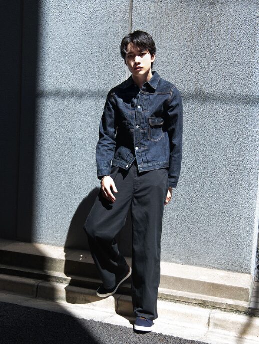 ウエストを緩めにし、少し落として履くと雰囲気が出る。