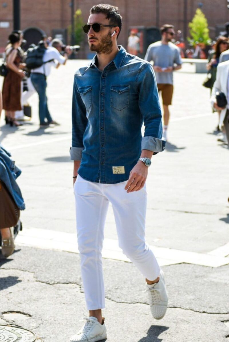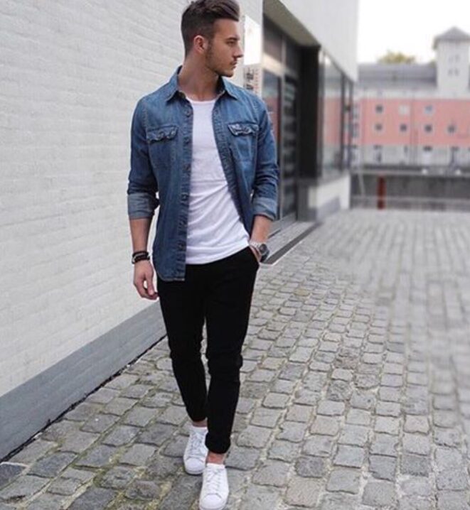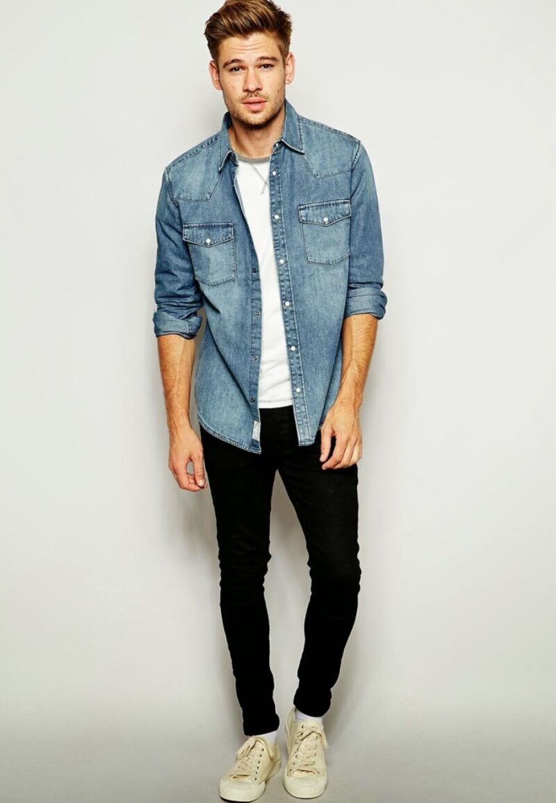 軽めのデニムシャツに白Tと細身パンツを合わせると、清潔感のある春らしい印象になります。