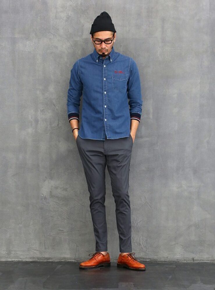 背が低い メンズ デニムシャツ コーデのコツ