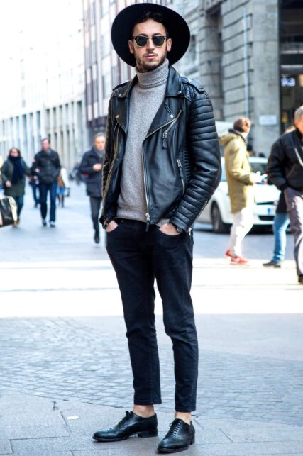 ミリタリー・レザージャケット × タートルネック|武骨×上品MIX