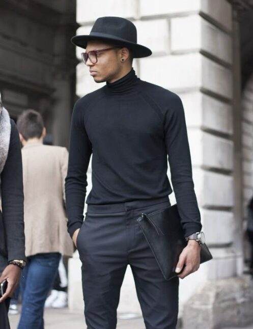 黒のタートルネックに黒のスキニーパンツを合わせると、モノトーンで大人っぽく洗練された印象を作れます。全体のシルエットをすっきり見せるのがポイントです。