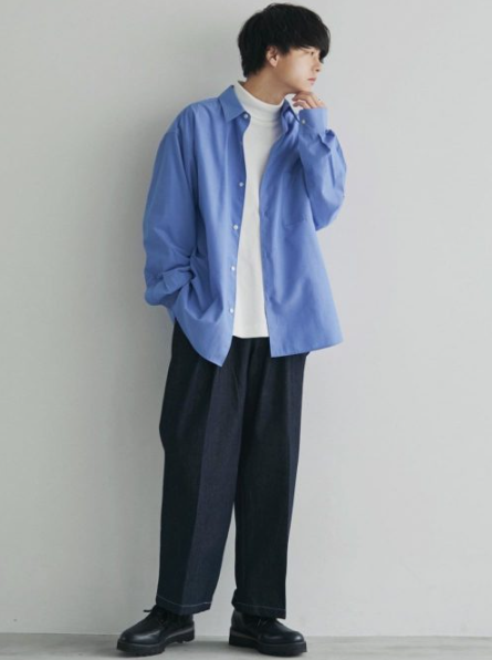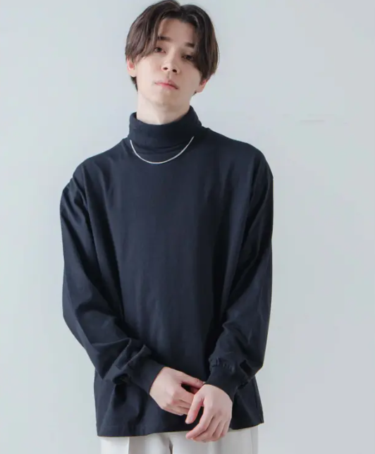 白シャツやオープンカラーシャツの上にタートルネックを重ねることで、知的で清潔感のある印象を作れます。レイヤードの高さやシャツの見せ方で雰囲気を変えられるのも魅力です。