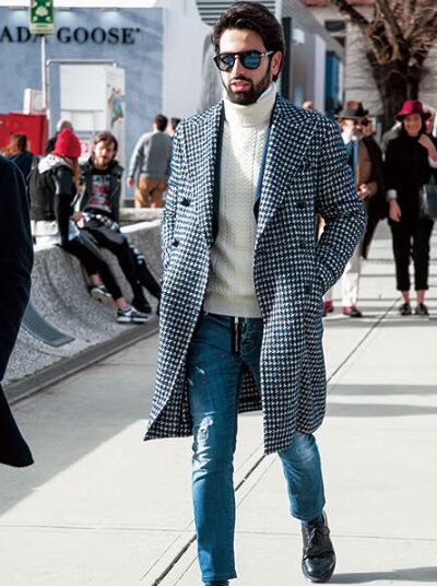 ロングコートとハイネックのタートルネックを合わせることで、冬の街中でも洗練された大人の雰囲気を演出できます。ストリート感を抑えつつ、女性ウケする落ち着いた印象を作れます。