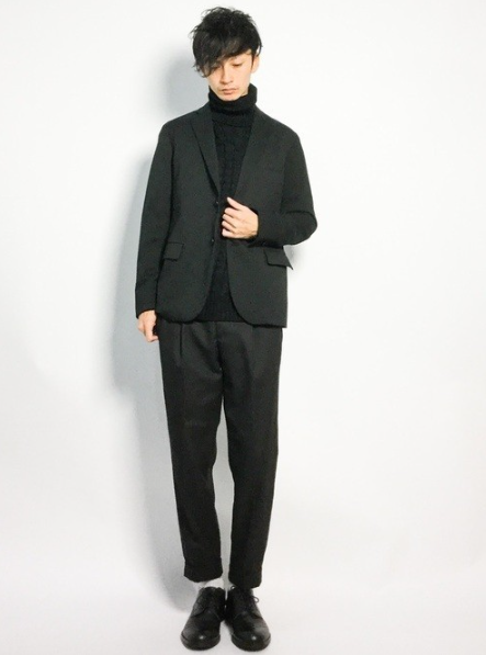 セットアップにタートルネックを合わせれば、ビジネスでもカジュアルでも通用する洗練されたスタイルになります。シンプルながら女性ウケも良く、着回し力も高い組み合わせです。