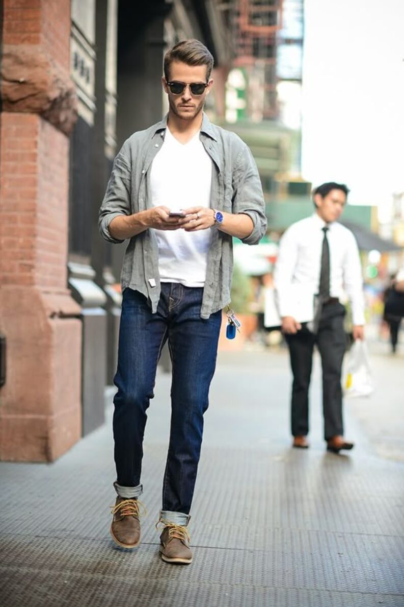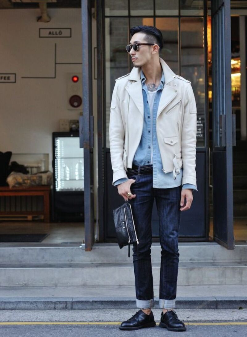 革靴はデニムのカジュアルさを一段引き上げます。折り返しは細めで揃え、靴の美しさを邪魔しないこと。30代・40代のきれいめ寄りにもよくハマります。