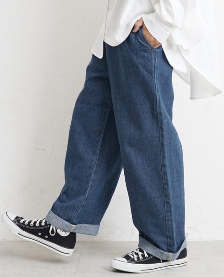 ワイドや太めは、少しのバランス崩れで野暮ったく見えます。コツは、折り返しを目立たせず、上半身をすっきり見せること。トップスの丈感やシルエットを整え、足元はシンプルに締めると“今っぽい”方向に寄せられます。