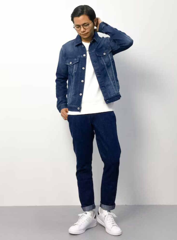 春夏は、淡いブルーや中色デニムを選び、ロールアップで足首を少し見せると一気に季節感が出ます。スニーカーは白を選び、靴下は見えにくいタイプで素足っぽく。トップスは白Tや薄手ニット、シャツなど軽い素材でまとめると、爽やかで女性ウケしやすいバランスになります。