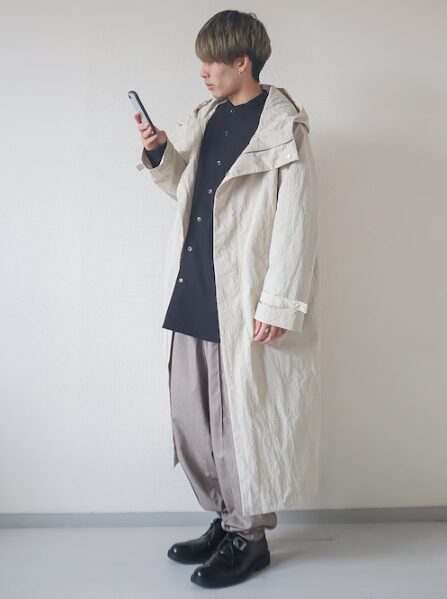 モッズコートの存在感に合わせて、ボトムにワイドパンツを持ってくるとモード感のあるおしゃれさが際立ちます。