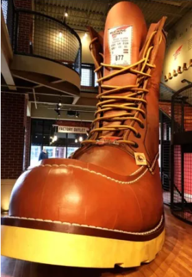ミネソタ州レッドウイングにあるレッドウイングシューズ本店と世界最大のブーツ。