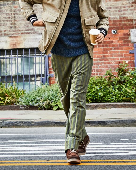 ロールアップすることで脚の縦ラインが強調され、低身長の方でもバランス良く見せられます。明るめのチノと875モデルの相性が特に良いです。