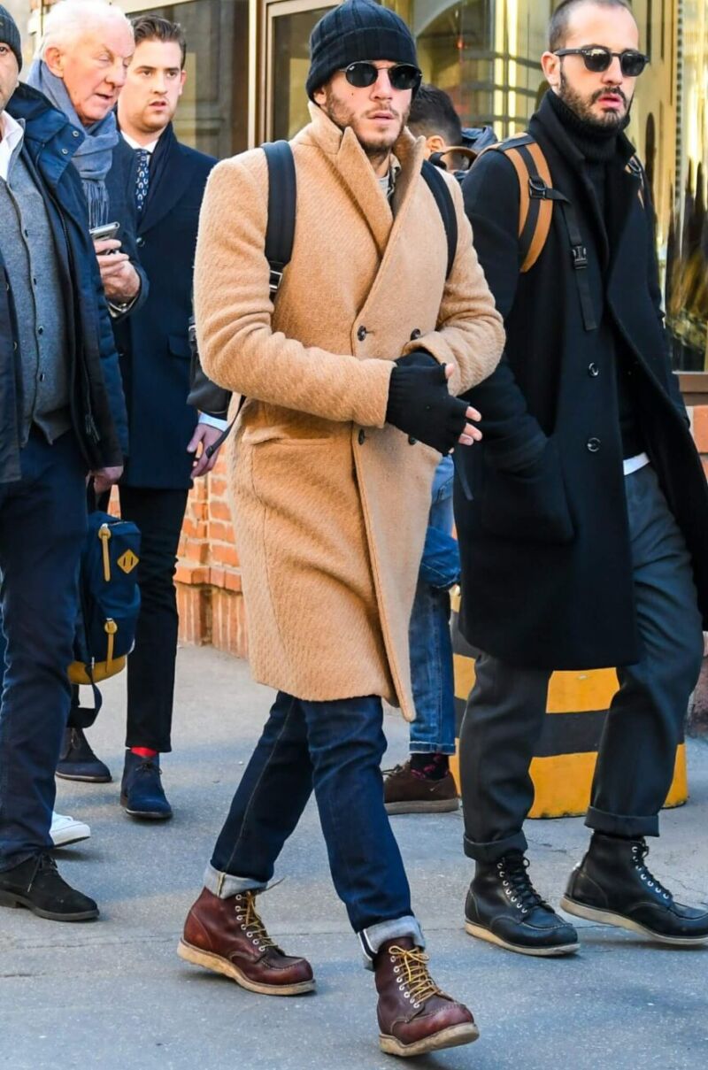 チェスターコートとレッドウイングの組み合わせは、大人の落ち着きと無骨さのバランスが魅力です。脚元のボリュームが冬の重厚感とマッチし、都会的な印象に仕上がります。