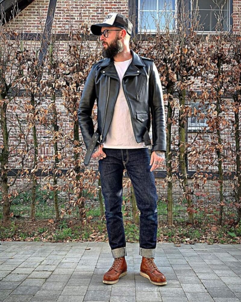 レザージャケット×レッドウイングのバイカー風スタイル