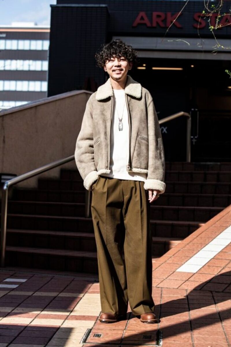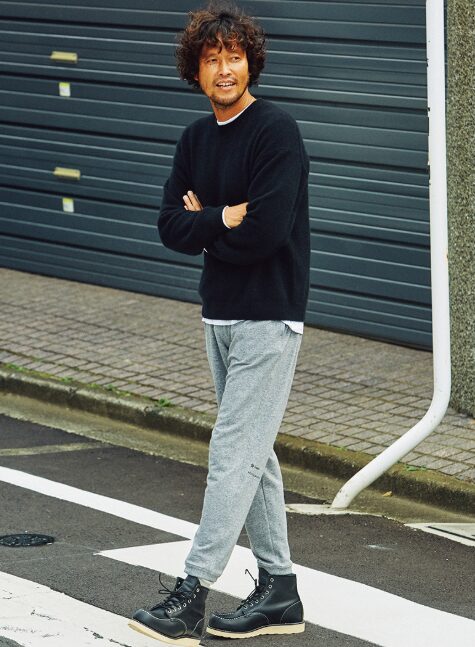 ゆるめのトップスとレッドウイングの組み合わせは、一歩間違えると重く見えます。上半身は軽く、下半身は適度に太さを残すことで清潔感を維持できます。
