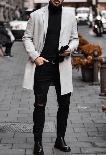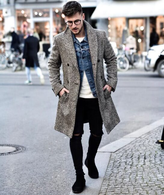 秋冬はアウターとのレイヤードがポイントです。黒デニムにコートやジャケットを重ねると、立体感のあるコーディネートが完成します。