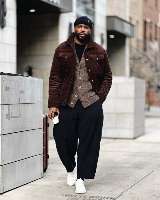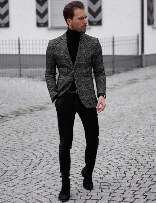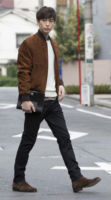 インナーにタートルネックやシンプルなシャツを合わせ、足元を革靴やブーツでまとめると、セットアップ風でも個性が際立ちます。