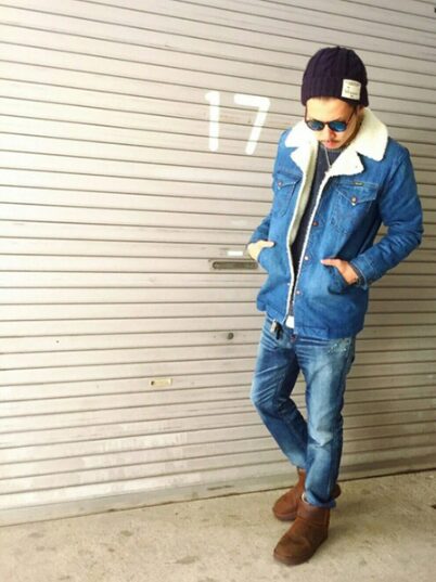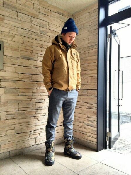 防寒性の高いスノーブーツを、デニムパンツと合わせてバランスよく着こなすのがポイント。デニムの裾を軽くブーツインすることで脚長効果も期待できます。