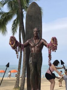 ハワイのワイキキビーチに立っているデューク・カハナモクの像。日本で言えばハチ公の像以上に有名な像です。
