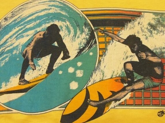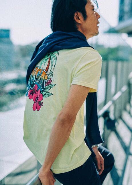 70年代らしいフェード感のあるサーフTシャツは、令和コーデではワイドパンツや古着ミックススタイルに取り入れると一気におしゃれ度が上がります。