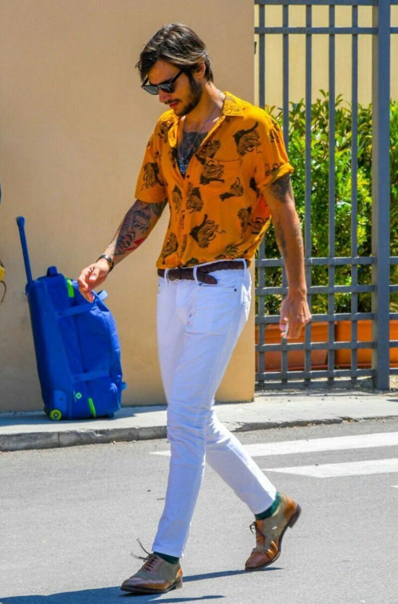 サーフボード柄はレトロ感が強いため、無地パンツでバランスをとると女性ウケの良い清潔感ある令和アレンジになります。プリントや柄として「サーフボード」「ヤシの木/パームツリー」「波」「トロピカルモチーフ」などが描かれているもの。ハワイアンシャツやオープンカラーの半袖シャツ形式が多い。