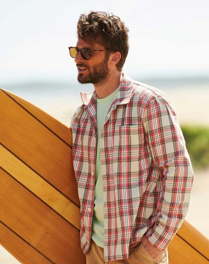 サーファーファッションに欠かせないのがチェックのシャツを合わせたコーデ。カジュアルで脱力系がイカしたサーファーファッション。