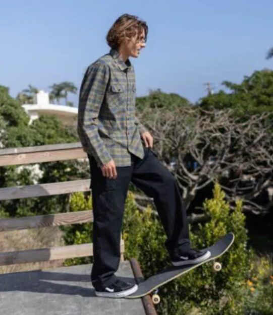 チェックシャツにダボパンを合わせたスケータースタイル。シンプルかつスタイリッシュなスニーカーを合わせるのがおしゃれ。