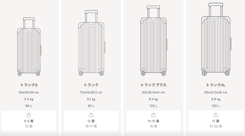旅行日数や目的に合ったサイズを選ぶことで、快適さが大きく変わります。RIMOWAはラインナップが豊富なため、用途に応じた選択が可能です。