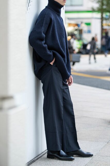 スラックスはセンタープレスが入ったテーパードタイプを選ぶと、脚をすっきり見せながら上品な印象に仕上がります。ブーツの丈感とスラックスの裾を合わせることで、バランスの取れたシルエットが完成します。