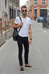 白Tに黒デニムのモノトーンシンプルコーデにはもちろんパンツに合わせたスリッポン。これ以上ないシンプルなコーデなのになぜかおしゃれ♪