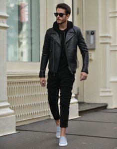 ライダースを主役にしたブラックコーデ!パンツの丈とスリッポンで遊び心満点!ここでブーツを合わせずスリッポンを合わせるところがおしゃれ上級者♪