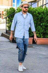 VANSのスニーカーならデニムシャツと細見のパンツでアメカジコーデにもスタイリッシュなシルエットによく映えます。